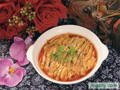 原料: 嫩公鸡脯肉、腿肉250克、芝麻酱5克、红油辣椒10克、白糖2、5克、口蘑酱油15克、味精0、5克、花椒面0、5克、葱白5克、芝麻油1、5克。