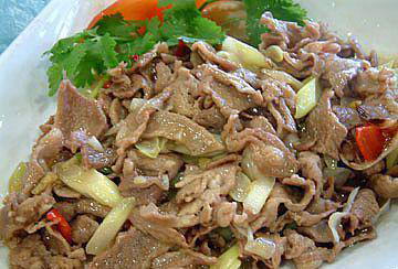3、用生油、麻油、大蒜头(折碎)炝锅烧至高热时,将放在碗里的羊腿片、京葱等材料倒入,用大武火很快地爆炸几下,再加少许麻油,醋起锅。