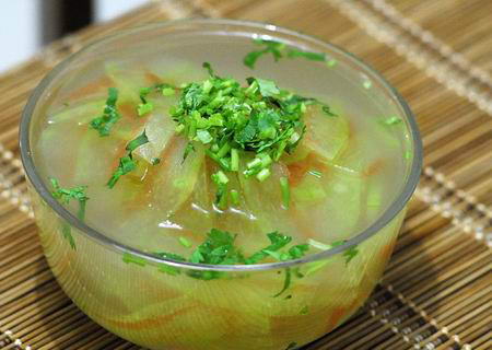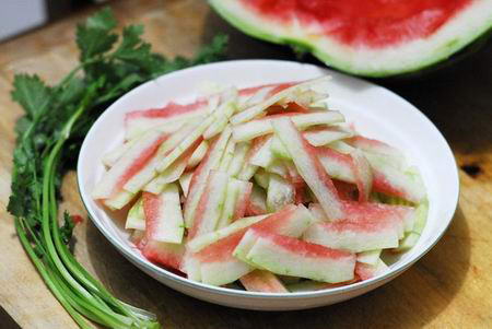 吃完西瓜,剩下的西瓜皮往往丢弃,用西瓜皮做一个汤,也是一道美味哦.西瓜皮切片,放在清水里煮开,撇去浮末,放盐、胡椒粉、鸡精,撒上香菜碎就做好了,是不是“废物利用”呵?