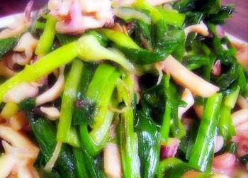 6、加入韭菜一起翻炒,时间要快,火要旺。韭菜为蔬菜,过分反超容易使营养物质流失,且水分会过量流出。