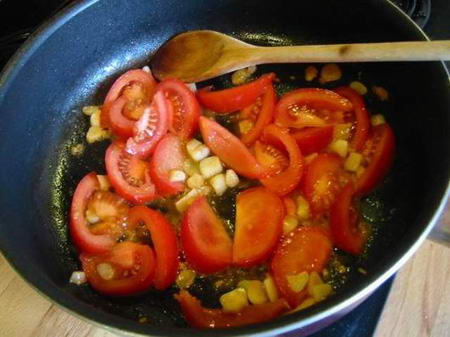 放入番茄,等番茄出汁,倒进刚才调好的调料。