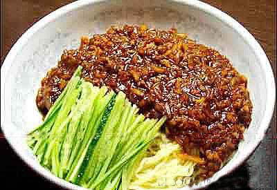 六必居的干黄酱1袋、天园酱园的甜面酱半袋(剩下半袋可以做中式沙拉,蘸萝卜,生菜吃),鸡蛋2个,肥瘦肉丁(去皮)100g,五花肉切成半厘米见方的小丁。各种菜码越多月好,黄瓜和豆芽还有俗称心里美的萝卜以及黄豆是不可少的,别的大白菜心、青豆、豆腐干、豆角丝就看着准备吧。当然生大蒜也是必不可少的,夏天吃着杀菌,还有大葱、姜末。