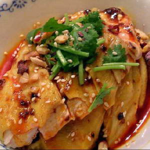 3、在小碗放入花椒粉、辣椒粉,用香油把花椒和干辣椒稍微炸一下,稍凉后一起倒进小碗。加入炸好的花生、白芝麻、葱末、姜末、蒜末、糖、醋、生抽,调匀后浇到鸡块上。