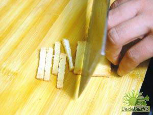 1:老豆腐切成0.5厘米厚的片,倒入热油中,以中火炸至金黄色,捞起沥干油摊凉。
