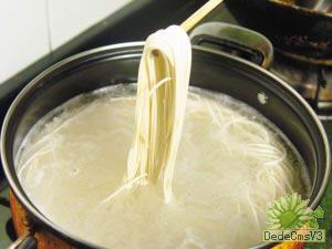 4:烧开半锅水,加入1汤匙盐,放入龙须面搅散以中火煮沸,点一次水煮至沸腾,捞起过冷河,沥干水盛入碗内。