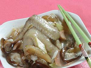 水发海参100克,鸡翅500克,火腿片25克,水发冬菇2朵,小排骨100克