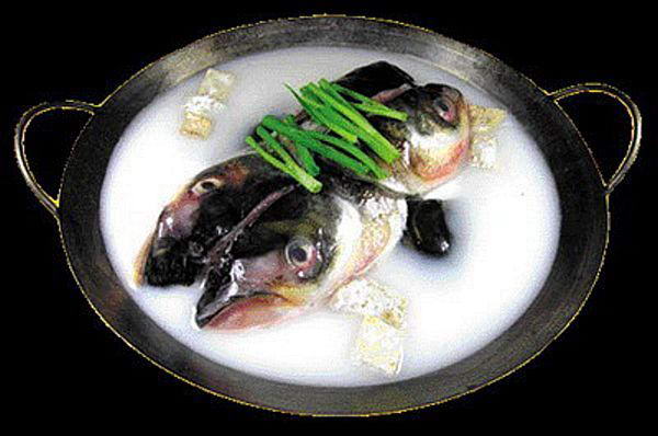 大湖鲢鱼头一个,洗净劈开,起油锅,煸香三五支小辣椒,再煸香蒜头两三枚,然后将鱼头推入锅中,待鱼头呈金黄色时,加葱姜调味及水,再加老抽、生抽适量,少许白糖。