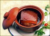 制法:五花肉煮熟之后切成方块,沙锅内放入葱,姜块垫底,五花肉皮朝下放在葱姜上,加入酱油,白糖,黄 酒,葱结,加盖先用旺火烧开,再用微火焖2小时,再将肉块装入陶罐,加盖,以桃花纸密封,上笼蒸透即成。