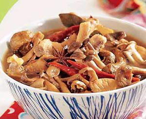 3.坐锅烧热,放入少量油,待油热后放入鸡块翻炒,至鸡肉变色放入葱、姜、大料、干红辣椒、盐、酱油、糖、料酒,将颜色炒匀,加入适量水炖十分钟左右后倒入蘑菇,中火炖三四十分钟即成。