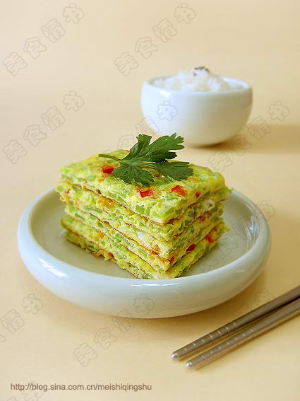 6.平底锅加热,加入适量油,晃动锅子,使锅底布上一层油即可,倒入苦瓜蛋液,用小火慢慢煎至底部凝固,翻面继续煎另一面,两面都煎至金黄就可以取出放在案板上,切小块装碟就可以了。