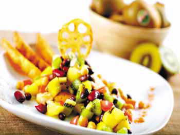 原料:素肠2根、洋葱15克、青红椒15克、奇异果半只、咕噜肉汁40~50毫升、淀粉少许、油半斤。