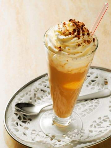 配法:啤酒一瓶置冰箱内;玻璃杯两只,放入碎冰块和巧克力冰淇淋球;取出啤酒注入杯内,摇晃均匀即可饮用。