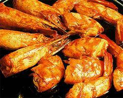 2、煎锅内加油烧热,放入虾段,反复煎炸至熟,放入料酒、糖、酱油拌匀移出即可。