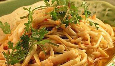 4.放入金针菇炒,加一点陴县豆瓣酱,一点镇江香醋,一点糖翻炒片刻,就可以出锅了,软,脆,滑,香、咸、辣、甜各有天下。