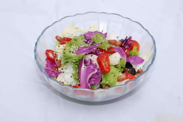 做法:把各种蔬菜仔细洗干净,切好装汤盆里备用。淋花椒油,白醋,蒜瓣,少量盐,鸡精,最后放上炸好的花生米与蔬菜拌匀,完成。