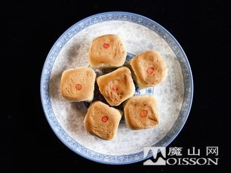 在每个饼坯中央用手指压一小孔,扫上蛋浆,粘上榄仁,再扫一次蛋浆,入炉烘烤至金黄色,饼面有裂纹为佳。香甜细嫩,油而不腻,滋阴补肺肾。