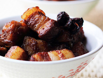 原料:五花肉、红薯、色拉油、盐、冰糖、葱5克、八角1个、料酒、老抽