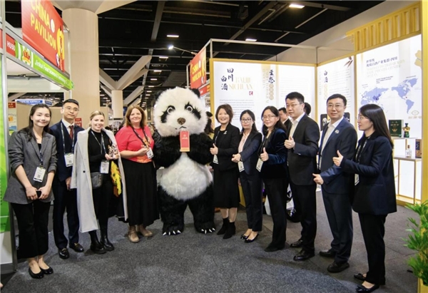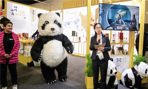 川酒展区以川酒地图为背景,介绍了川酒的地理标志、历史文化、产业优势、产区特点;融合了憨态可掬的熊猫、青翠欲滴的竹子、古朴厚重的酿酒器皿等极具代表性的四川元素,吸引国际友人驻足观赏;聚焦展示了以五粮液为代表的川酒产品,经典五粮液、五粮液·熊猫造型酒成为展馆一大亮点,吸引国际友人打卡合影,极大地丰富了世界对五粮液乃至川酒的认知。