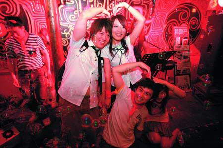 六一那天,后海的琥珀酒吧举办了“装嫩Party”,要求大家穿学生装或童装入场,因为现场有最“装嫩奖”的评选。来参加派对的朋友大多都是便装进门,主办方准备了红领巾发给所有朋友,现场的所有工作人员还戴着少先队干部的标志:“一道杠”“两道杠”“三道杠”,十分齐全。但真正的Party animal早已经定做好了各式学生装入场,日本的校服最受欢迎,还有造型师做现场装嫩造型。