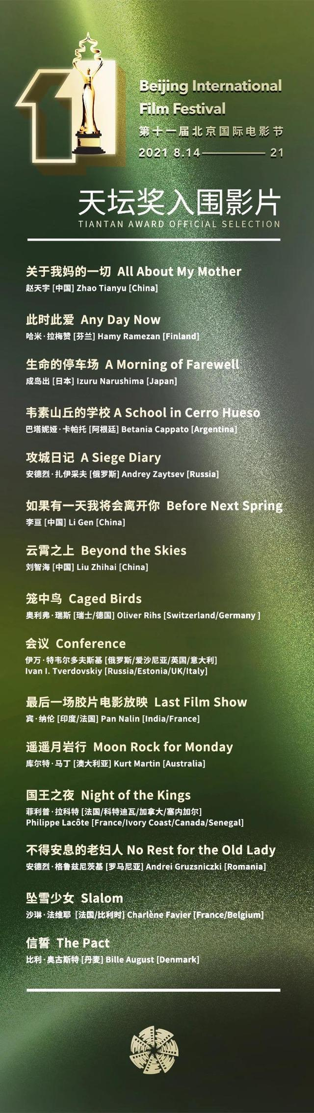 近日,第十一届北京国际电影节组委会召开新闻发布会,宣布本届电影节主题为“新机·新局”,将于8月14日至8月21日在北京举办。同时,作为第十一届北京国际电影节的重头戏——“天坛奖”,北京国际电影节组委会面向全球,征集2020年1月1日以后出品的优秀影片。现场公布了15部国内外入围佳作,其中国外影片12部,国内影片3部,分别是《关于我妈的一切》、《云霄之上》以及《如果有一天我将会离开你》。入围影片各有亮点,既有世界重量级导演的最新作品,也有新锐导演的惊喜之作,且包含多部第一次亮相的首映影片。