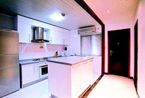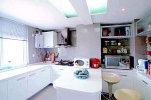 灰色与白色的搭配使整个厨房显得洁净、整齐。橱柜的选择充分考虑到了居家的实用性,中间岛在整个设计中显得十分抢眼,它既考虑到了本身的储物功能,又充当了吧台,可谓一举多得。这套设计为厨房增加了生趣,些许的温暖、宁静与柔和。