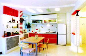 简单的吊顶在空中划出优雅的弧线,把偌大的空间划分出层次。鲜艳的红白两色在所到之处以不同的方式自由调和,无论是左侧墙面上的精巧的展示柜,还是原木色的简单桌椅,亦或是右侧造型独特的灯柱状玄关,彻底驱逐了传统厨房的沉闷,处处洋溢着耀眼的光芒和跃动的色彩……