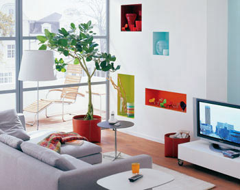 在墙上挖几个方块,刷上鲜艳的色彩,摆放进鲜艳的饰品,另一半墙上则是带灰色的浅色条纹组合。这是属于色彩图A和色彩图B的颜色组合的案例,由于选用的都是亮度较高的颜色,而且是多种颜色小范围组合,所以搭配起来也显得谐调。
