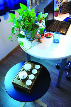 床头的移动小桌子,极具创意,是整个房间里引人注目的亮点。在休息天,小桌子上摆好吃的喝的看的,就可以躺在床上消磨大半天时光,实在很惬意。小桌的底下是滑轮,滚来滚去,十分方便。Aries是个爱书的人,大多数时候,会在上面堆满书籍,随时取阅,很方便。