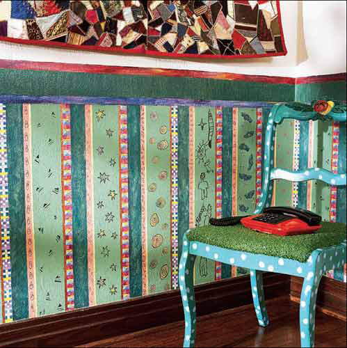 首先,用最浅色的乳胶涂料打底。晾干后,分出不同宽度的竖条,漆上颜色,注意每同样宽度的竖条漆一种颜色。最后,用漆笔、模板、小刷子在这些竖条上作画。等完成后,用丙烯酸油漆和薄刷子给自己的作品镶一圈饰边。