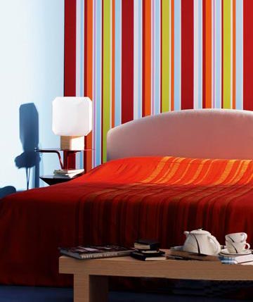 解决方法:靠床头的一面墙,贴上生性活波的彩条图案墙纸。大红的床品,上面同样有条纹图案作为呼应。简单的两处改变,房间马上变得活力四射。