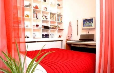 红艳艳的卧室,寒冷的季节比较适合,夏天换换窗帘、床品就可以了。