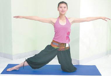 从跪姿开始,右腿伸向右方,让右脚和左膝处在同一条线上。右脚指向右侧,右膝不要弯曲。双臂充分地向两侧伸展,使之与地面平行。