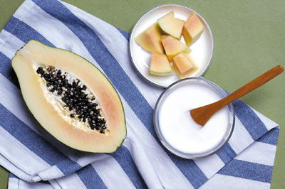 酸奶中的乳酸,有不错的保湿功效,还有去角质作用,可让肌肤快速恢复光泽、嫩滑。木瓜含丰富糖分、有机酸、脂肪蛋白质、维他命B、C、G等,未成熟果的乳液中含有两种生物碱,一为木瓜蛋白酶,一为脂肪酶。木瓜蛋白酶可分解蛋白质为氨基酸,脂肪酶能分解脂肪。如果内服,则具有健脾胃、助消化、清暑解渴的功效。外用时,木瓜蛋白酶可以选择性地溶解皮肤表面的老化细胞,在除去无用角化蛋白的同时,不会伤害新的活细胞,能还原黑色素各中间体,抑制黑色素细胞生成和酪氨酸酶的激活作用,补充肌肤所需的大量水分及养分,让肌肤显得更明亮、更清新。所以很多净化洁面凝胶都含有木瓜酶成分。通常,青木瓜的木瓜酶是成熟木瓜的2倍左右,因此,选择青木瓜的效果是最佳的。
