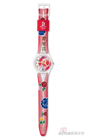 透明塑料表壳下,是以大红色牡丹为底纹的轻盈表盘,所有钟点均采用宝蓝色的阿拉伯数字表示。方头的时针和分针均为黄色,细长的秒针为宝蓝色。点睛之处就是透明的表环上印有“Beijing 2008”与奥运五环标志。Swatch独具匠心的在腕表设计中融入中国的国花—牡丹,不仅唤起人们对富足安康生活的梦想与追求,亦将这富含中国民俗特色的元素推向了全球时尚界。