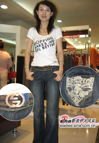 牛仔搭配T恤的H造型显得修长苗条。裤兜上蕾丝花纹和水钻点缀,腰间皮带为简约装扮增光添彩。
