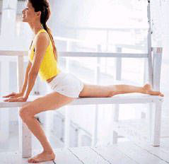 动作: 脸向下,趴在长椅上(床沿),左脚放在地面上,左脚尖与肩在一条垂直线上,向后伸右腿,挺胸,双手支撑起身体。