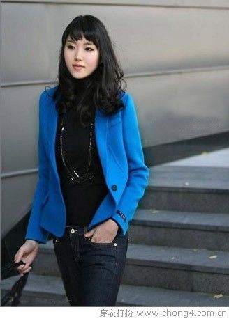 天蓝色是去年的流行色,今年依然受欢迎。搭配黑色打底薄衫再加一条黑色发亮的毛衣链,非常干练的OL形象。