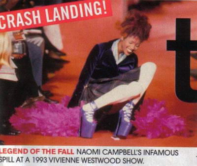 比如“黑珍珠”Naomi Campbell,这位因为T台摔跤而令时尚史偶尔幽默的名模,所演绎的Vivienne Westwood那双18cm高松糕鞋的p值见仁见智,但无论如何在当年领风气之先时,诱人度应当不低。至于y、L肯定是飙到了最高值,t的值会比较低——想想看,它刚在T台上被展示,预示着流行刚刚揭幕。我也可以肯定,Campbell没有喝酒,所以,这双鞋的高度可以达到12cm左右,显然,18cm是超过标准太多,结果在所难免。