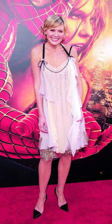 不规则剪裁的吊带裙,可爱的吊带设计和褶皱花纹在裙子上的蔓延,都突出Kirsten Dunst迷人的小女人气息,足以引发裸露遐想。