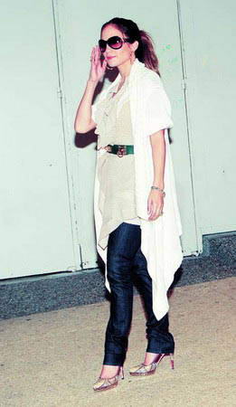 米色上衣与白色裁减不规则的罩衫叠穿,搭配藏蓝色窄腿裤和米色高跟鞋,内敛而不低调,让Jennifer Lopez如诗歌般美丽动人。