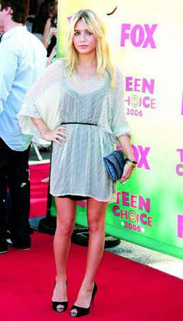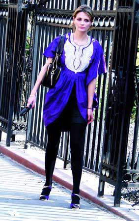 紫色宽松罩衫不论是胸前钩花的设计还是裙摆处微微内收的花朵造型,都让Mischa Barton与身惧来的公主气质有了更加完美的传达。