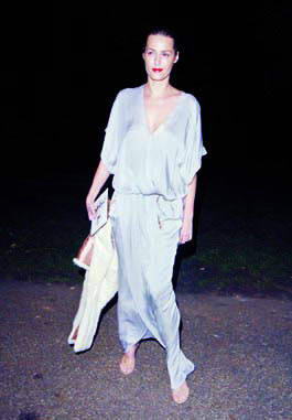 名模 Yasmin Le Bon夜现街头也不忘赚足眼球,银色缎面宽松罩衫裁减极具戏剧性,耀动的银色面料将她勾勒的像一具软雕塑,优雅中透露出一点不羁。