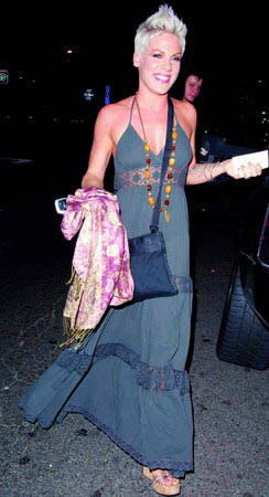 走摇滚路线的pink,在这个夜晚换了风格。一条宽松的吊带 裙搭配复古的吊坠项链,散发出浓郁的民族风情,高耸的银色短发为整体装扮增添现代味道。