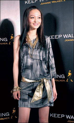 张韶涵 几何图案的斜肩连衣裙个性又大方,让骨感的小女生也多了点性感味道。夸张的金色蝴蝶结装饰相当抢眼。