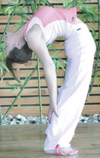 吸气,抬头挺胸,呼气,腰部充分向后弯曲,保持均匀呼吸。