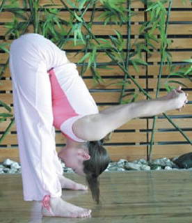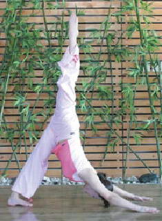 呼气,上半身向前向下,手臂自然向地面下垂。保持呼吸。