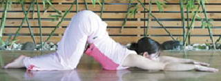 跪坐,双手向前伸展,提起脚跟,脚趾踩地。