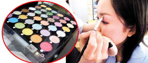 眼部的装点是桃花妆的重点部分:首先是画眼影,选用深桃红色的眼影紧贴睫毛画至眼皮一半处,再用浅粉色眼影画剩余部分,向上轻扫。最后用近萤光的高光眼影遮住眉毛以下,上眼皮以下的位置,部分覆盖浅粉色眼影。这样整个眼部便有了立体和层次感觉,也使眼部灵闪动人。