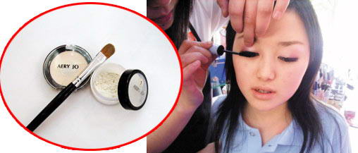 眼部的装点是桃花妆的重点部分:首先是画眼影,选用深桃红色的眼影紧贴睫毛画至眼皮一半处,再用浅粉色眼影画剩余部分,向上轻扫。最后用近萤光的高光眼影遮住眉毛以下,上眼皮以下的位置,部分覆盖浅粉色眼影。这样整个眼部便有了立体和层次感觉,也使眼部灵闪动人。