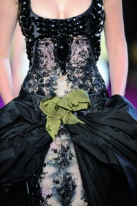 本季风尚的关键词之一即是廓型,只是不要想当然地认为只有呢子质地才能产生建筑般的轮廓,蕾丝同样可以。黑色的蕾丝与薄纱层层叠叠,制 成造型夸张的蓬蓬裙摆,再配上神秘诡异的烟熏妆容,就是从古堡里走出的精灵女子,比起那些萦绕着粉色蕾丝的甜美系公主显然更具诱惑。另外不得不提的仍是 PRADA,用层叠蕾丝营造出本季相当流行的腰间短裙效果,优雅而又干练